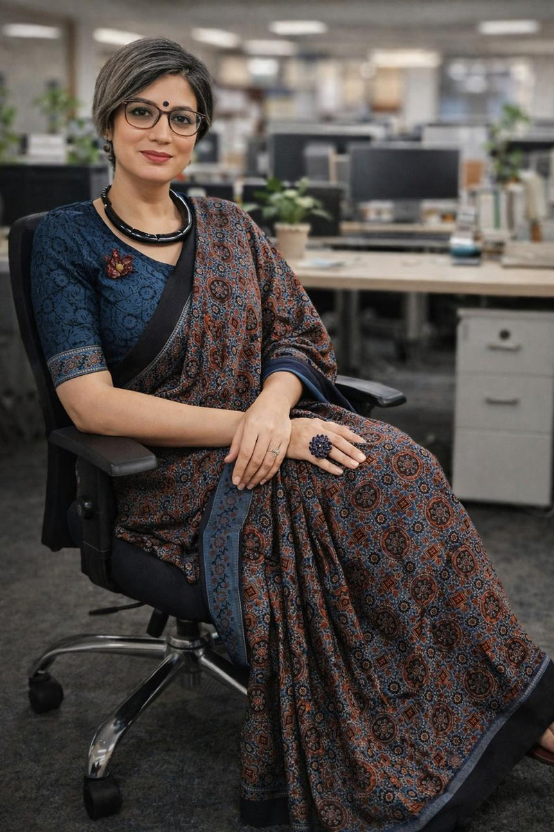 Black handblock mulmul cotton saree