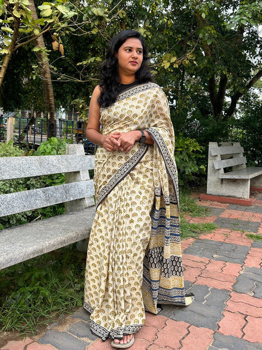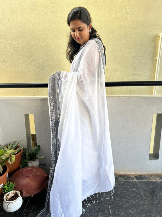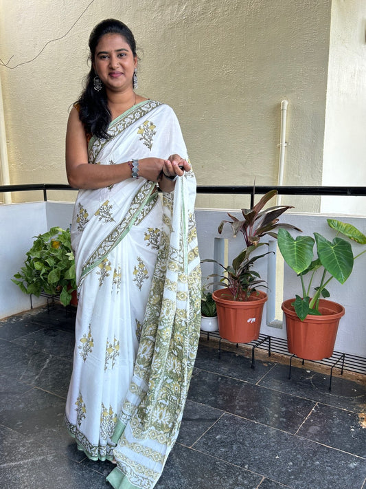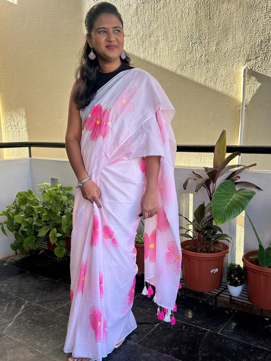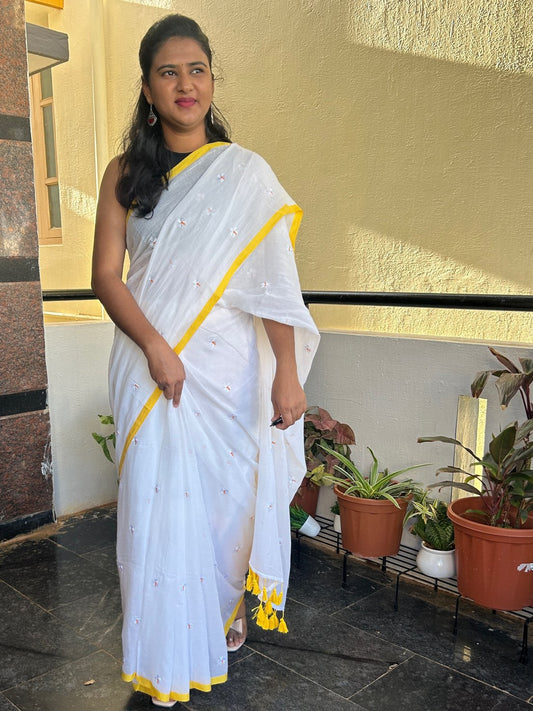 OFF WHITE HAND EMBROIDERED MUL SAREE